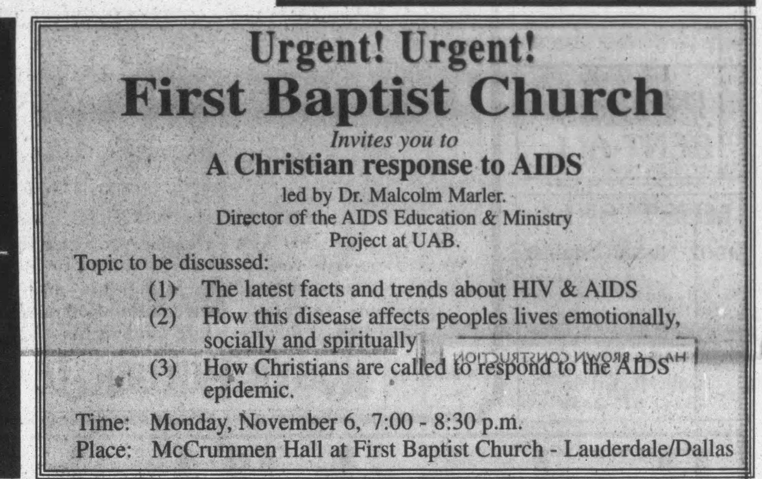 A clipping of a scan of the November 3, 1995 Selma Times newspaper with an advertisement for a class to teach interested parties how to deal with AIDS in a Christian manner. U