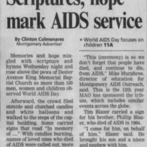 A 1999 article in the Montgomery Advertiser about an interfaith AIDS service taking place.