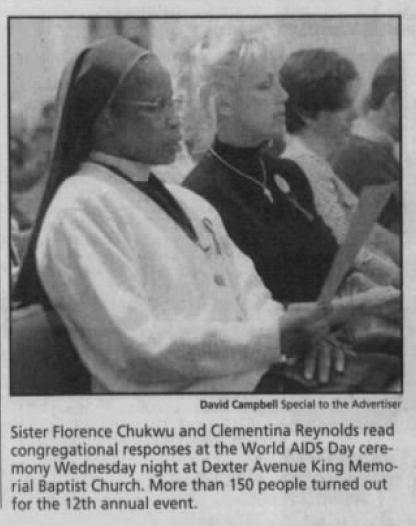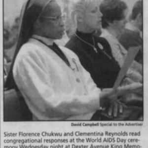 A clipping of a digital newspaper scan with an image of a nun (Sister Florence Chukwu) and another attendee (Clementina Reynolds) at a World AIDS Day interfaith Christian service on December 1, 1999 in Montgomery, Alabama at Dexter Avenue King Memorial Baptist Church.