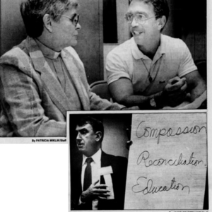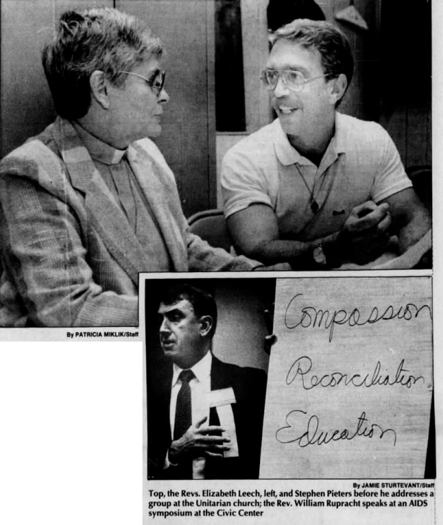 A clipping of the digitization of the October 21, 1989 edition of the Montgomery Advertiser's Religion Section that has a photograph of AIDS outreach attempts by churches. The top photo is of Revs. Elizabeth Leech (left) and Stephen Pieters. The bottom photo is of Rev. William Rupracht.