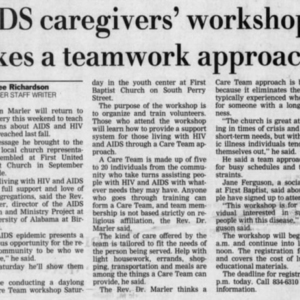 An article about AIDS Caregiving Workshops in the Montgomery Advertiser. It focuses on Malcolm Marler and the programs he ran through the 1917 AIDS Clinic at UAB.