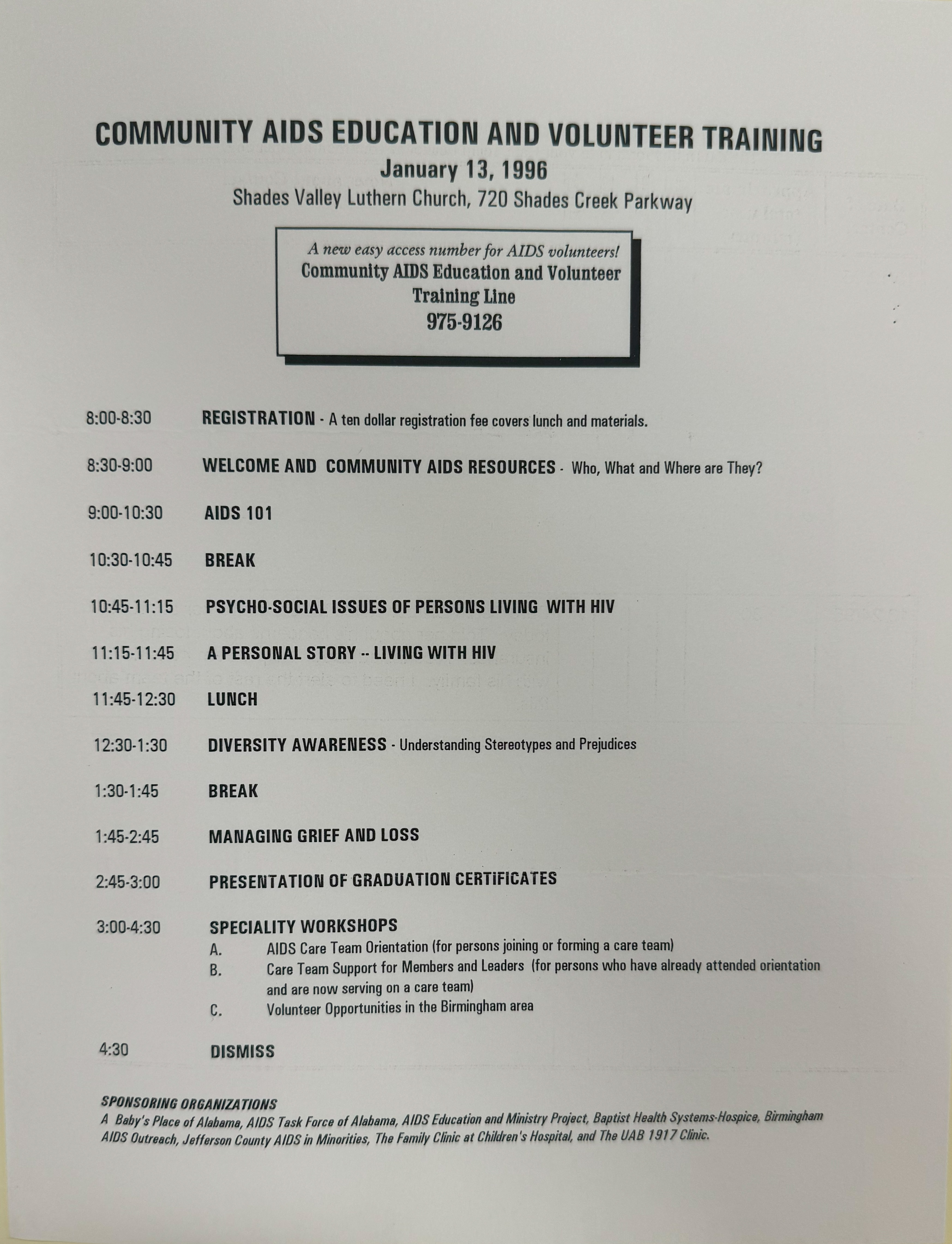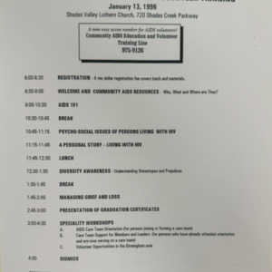 A detailed schedule for an AIDS training program hosted at Shades Valley Lutheran Church in January of 1996. It also shares a new phone number for AIDS volunteers to use, and lists the sponsoring organizations of the program.