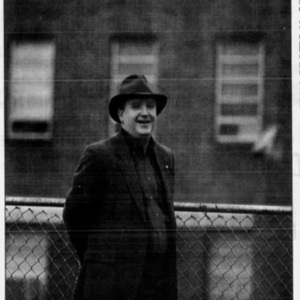 A black and white digitization of a photo from a 1992 issue of the Birmingham Post Herald of AIDS volunteer and activist Frank Romanowicz in front of the Agape House.