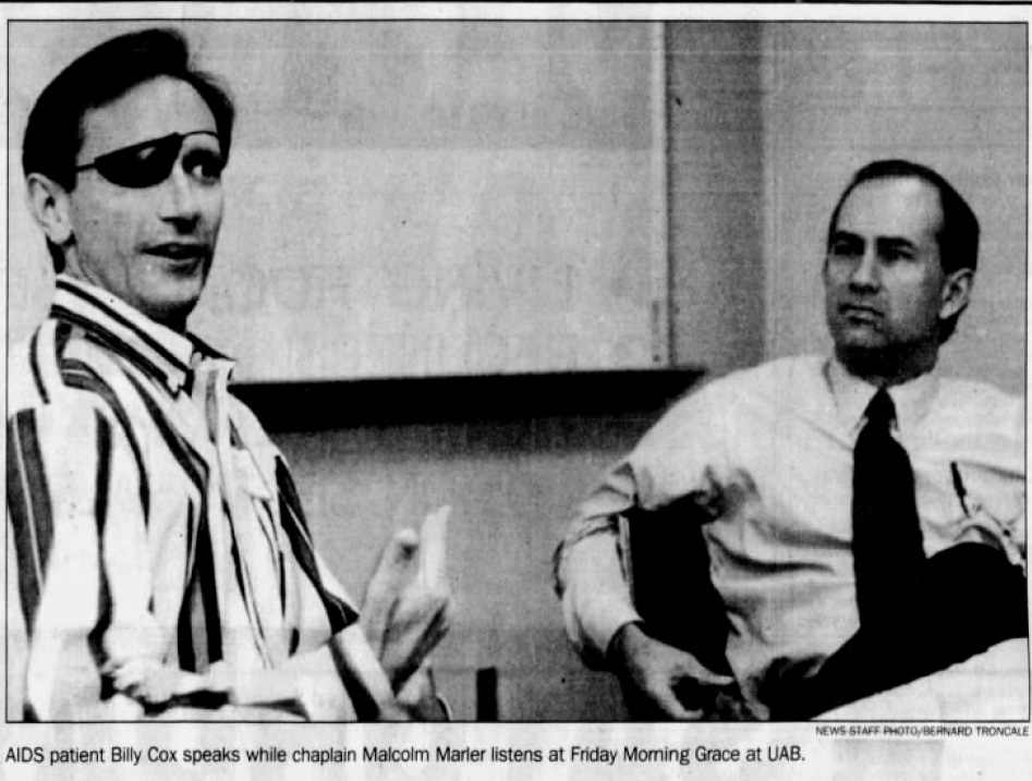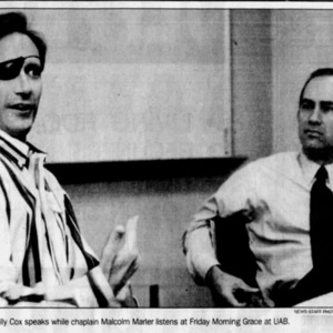 Rev. Malcolm Marler and AIDS patient Billy Cox speaking to attendees at a session of the Friday Morning Grace program at the 1917 AIDS Clinic. This is a photograph from a digitized edition of the Birmingham Post-Herald.