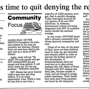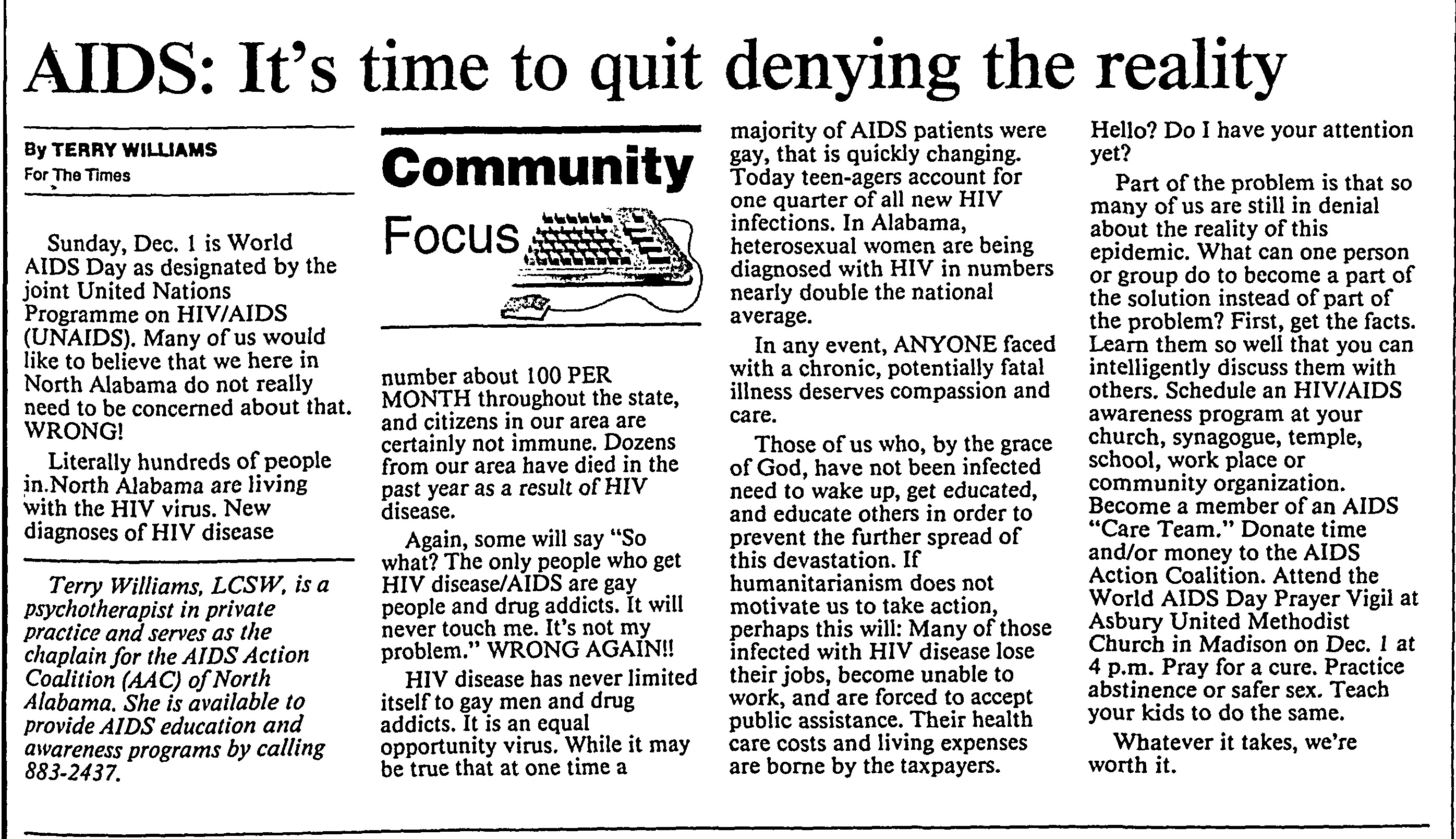 A digitization of a 1996 edition of the Huntsville Times. Psychotherapist Terry Williams wrote an article for the Community Focus part of the newspaper for World AIDS Day to talk about the reality of AIDS.