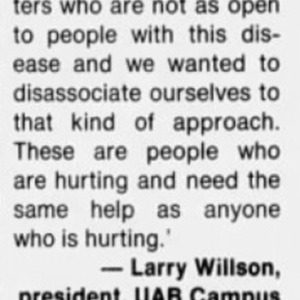 Larry Willson, “Larry Willson Newspaper Quote about AIDS,” UAH Archives, Special Collections, and Digital Initiatives, accessed February 11, 2026, https://digitalprojects.uah.edu/items/show/14748.