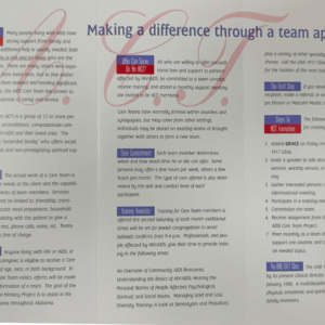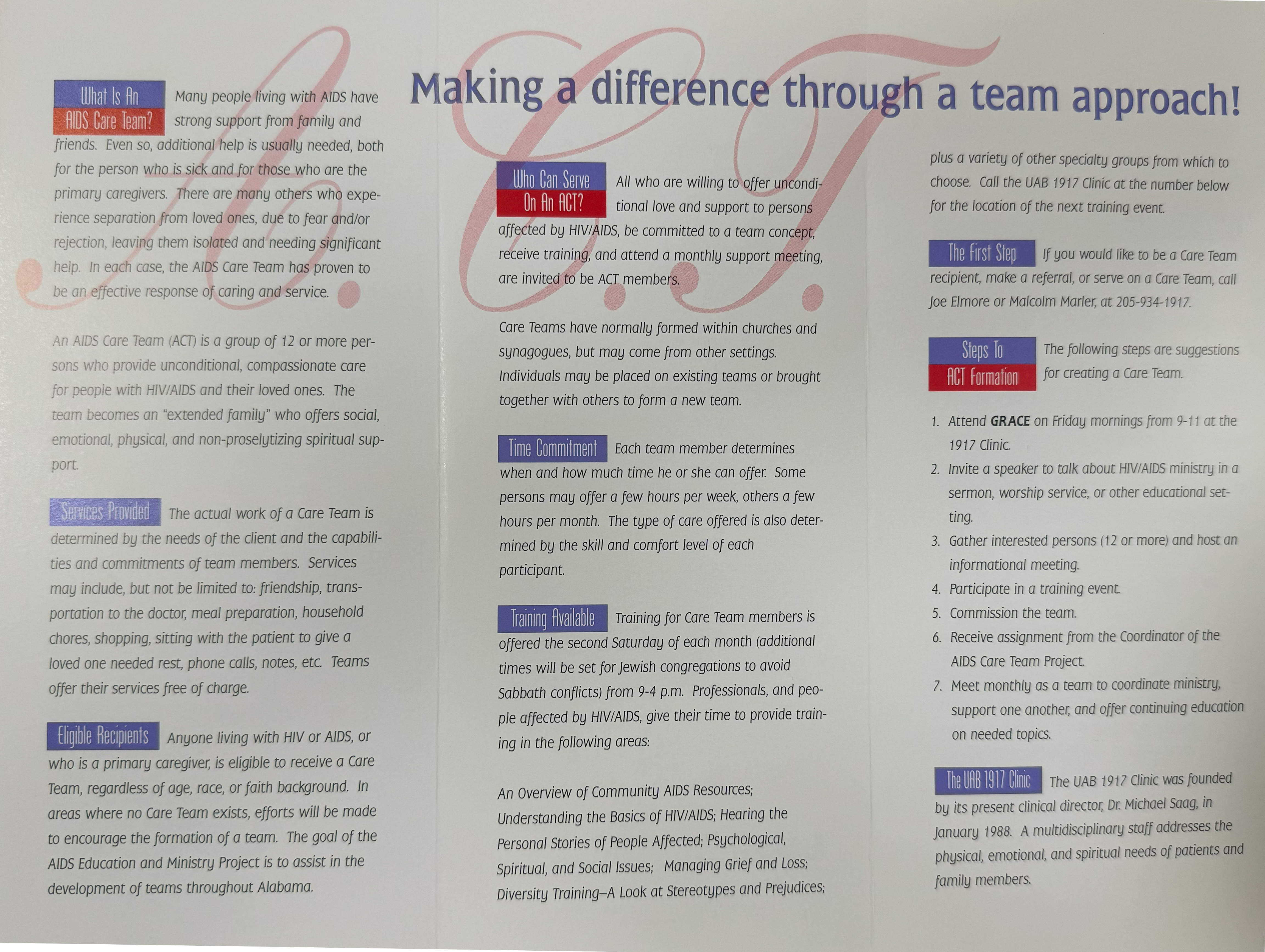 The front and back of an informational brochure for the AIDS Care Teams from the 1917 AIDS Clinic at UAB and the AIDS Education and Ministry Project at UAB. It gives an overview of how the program works and where to get training to volunteer with the program.