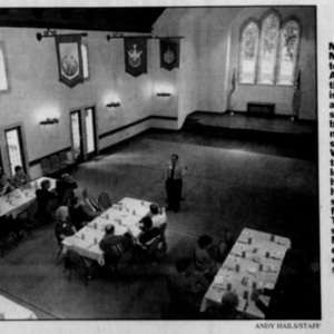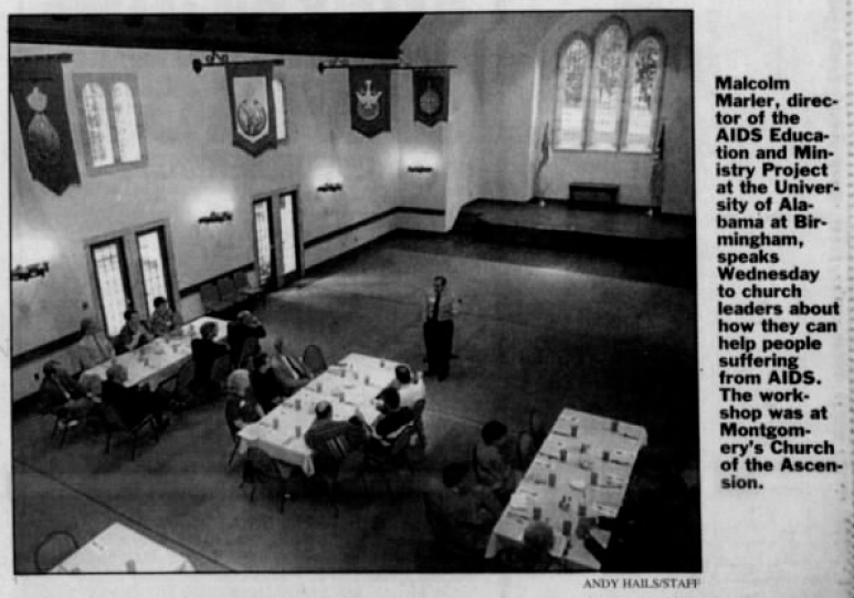 The Reverend Malcolm Marler speaks to church leaders and teaches an AIDS education session at the Church of the Ascension in Montgomery, Alabama. This is a black and white digitization of a photograph from a 1995 edition of the Montgomery Advertiser newspaper.