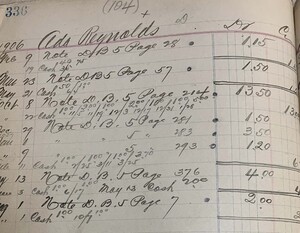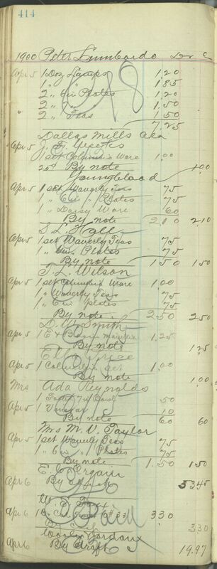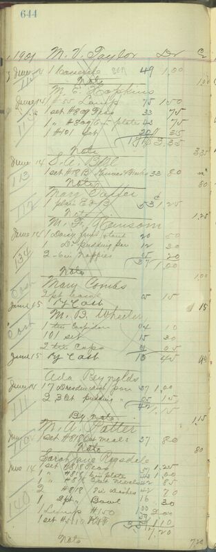 After April 5 and April 6, 1900, mill workers continued to go to Harrison Brothers and made small purchases of Queensware ranging from $0.60 to $2.00. The Harrison Brothers removed page 115 from the Customer Account Ledger and instead used "##" or "#" to identify mill workers in the daybooks. Mill workers can also be identified in later accounts by their unique payment "By note." Mill workers and individuals who made similar small purchases became the primary customers at Harrison Brothers and helped the store recover from the loss of its tobacco consumers. Women, especially mill women who made up a significant number of mill workers, began to overwhelm the store and often shopped in groups. Ada Reynolds and Mrs. M.V. Taylor were two frequent mill worker customers that came to the store with the first wave of mill workers in April 1900. The two women were among the few regular mill customers at Harrison Brothers.[5]
