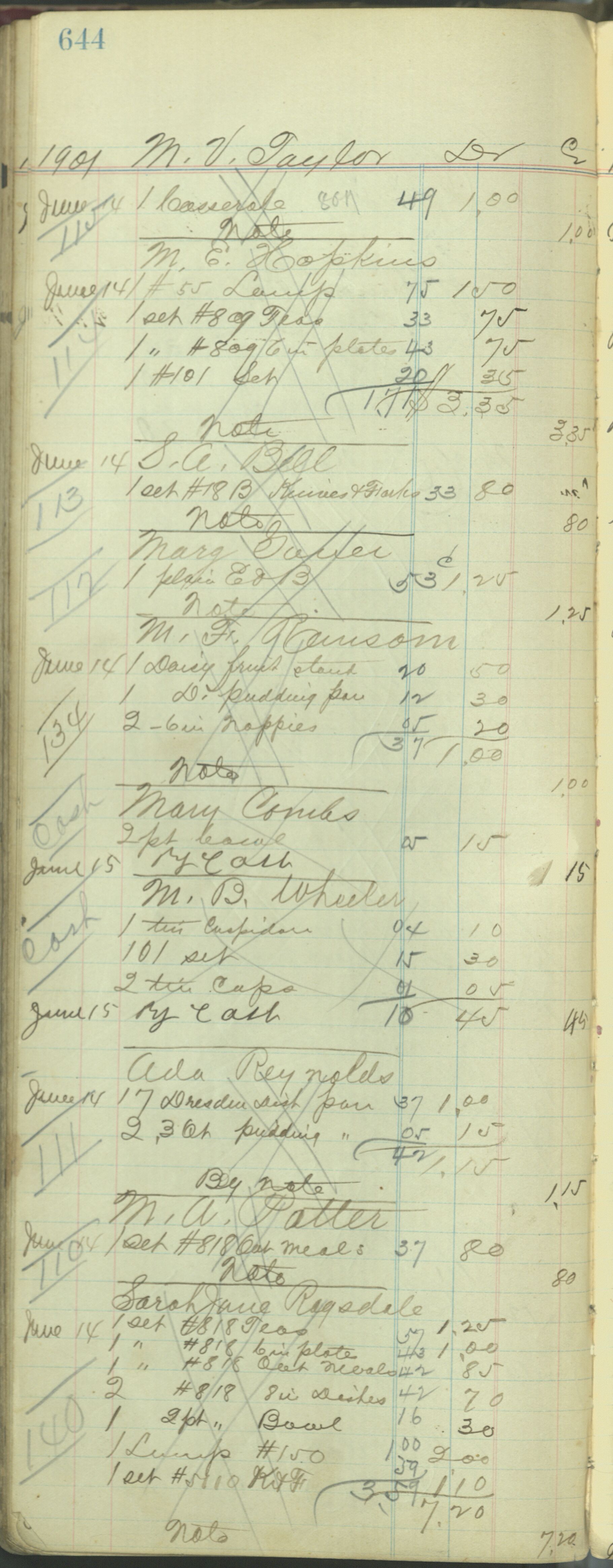 This is an image of page 644 of Harrison Brothers Hardware Company customer account ledger 1, 1897-1904. This page lists several transactions of customers without customer accounts, two of which, Ada Reynolds and M.V. Taylor are recurring customers and employees of local cotton mills. Customers on this page bought various Queensware products and paid by cash and by note. Many of the customers on this page are women.