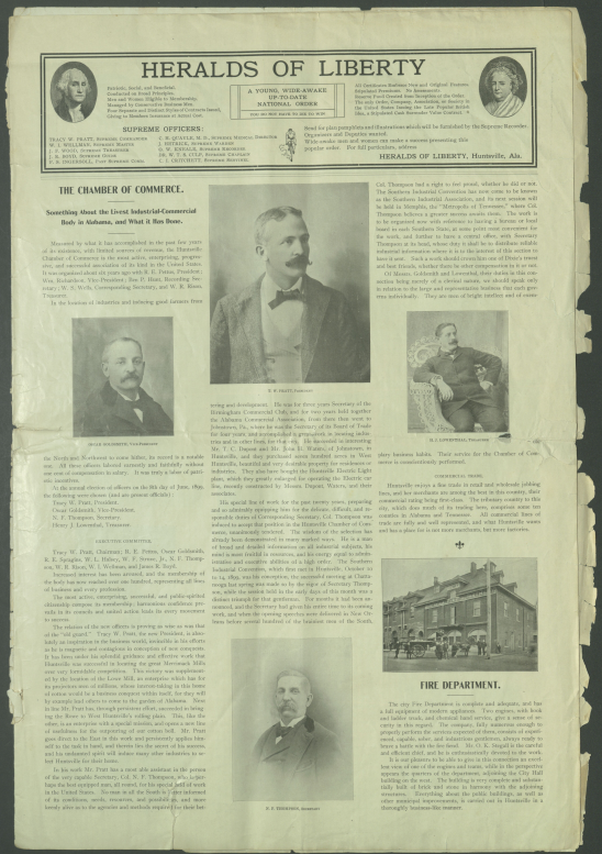 This is a page from the December 27, 1900, Art Industrial Edition of the Huntsville Post. This newspaper was used as a promotional material for the City of Huntsville. On this page, is an advertisement for the Heralds of Liberty, a progressive organization in Huntsville, and an article about the work of the Huntsville Chamber of Commerce. The men photographed on the page are Oscar Goldsmith, Vice-President; T.W. Pratt, President; H.J. Lowenthal, Treasurer; and N.F. Thompson, Secretary.