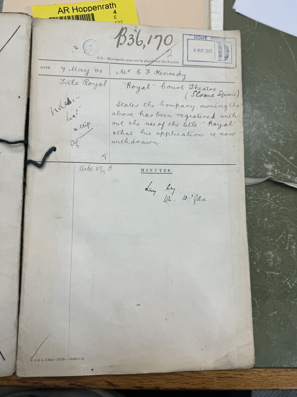 London Home Office, “Withdraw of application of the The Court Theatre to include the word "Royal",” UAH Archives, Special Collections, and Digital Initiatives, accessed February 11, 2026, https://digitalprojects.uah.edu/items/show/14599.