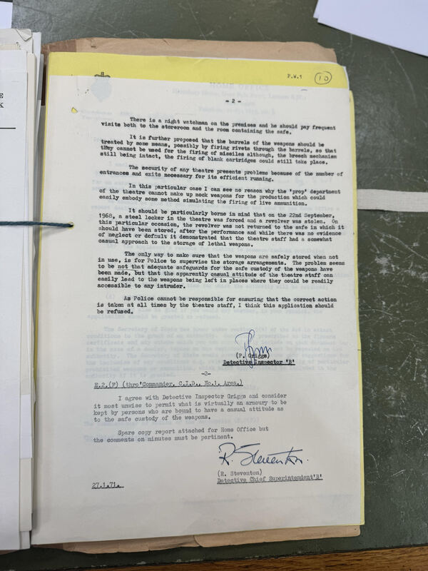 Detective Inspector P. Griggs makes a report denying a firearms certificate application on the notions of a prop not being made first, and previous unsafe behaviors with live firearms on the Theatre's property.