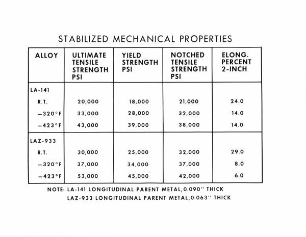 8 x 10 inch black and white photograph including a table that displays the stabilized mechanical properties of the following alloys: :LA-141 and LAX-933.
