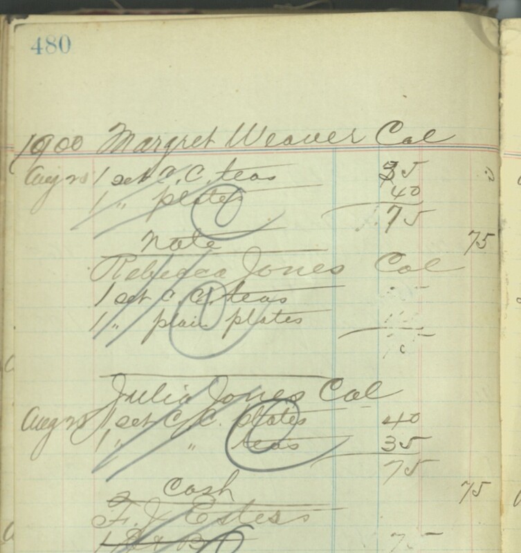 This image of the Rebecca Jones, Julia Jones, and Margret Weaver transactions from August 25, 1900, is cropped from page 480 of Harrison Brothers Hardware Company daybook 2, 1898-1902. The transactions on this page were paid for by note and cash and do not correspond to a customer account page. Rebecca Jones's transaction cost was erased and no payment type is listed for her purchase. In these transactions, the customers purchased plates and tea sets. "Col." was written after the three customers' names to indicate that they were Black.