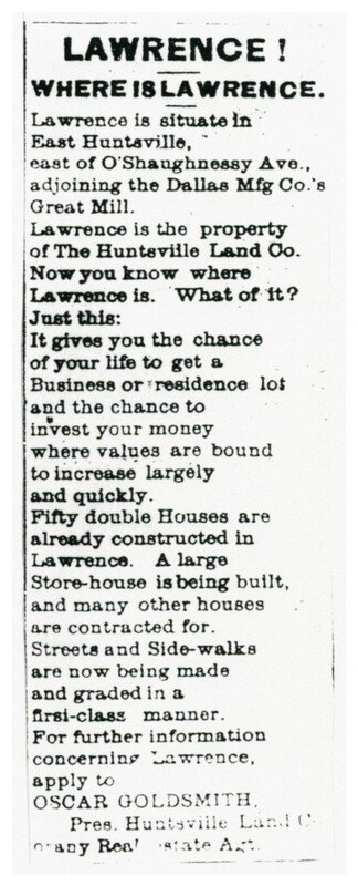 This is a copy of a Huntsville newspaper advertisement for Lawrence Village. This advertisement detailed where Lawrence Village was and promoted the rapidly expanding community built by Huntsville Land Co. The text at the end of the advertisement states "For further information concerning Lawrence, apply to Oscar Goldsmith, Pres. Huntsville Land Co." Lawrence was the name of Oscar Goldsmith's son.