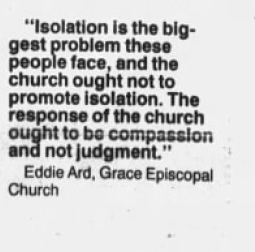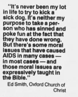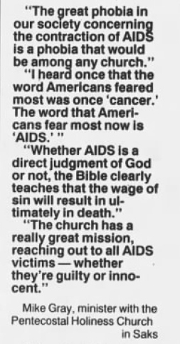 A clipping of a scan of the October 10, 1992 Anniston Star that contains quotes of what different faith leaders believe about AIDS.
