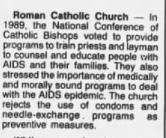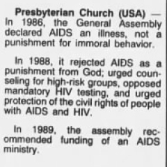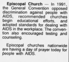 Clippings of a scanned newspaper from the October 11, 1992 Anniston Star. It summarizes where different religious denominations stand on the topic of AIDS.