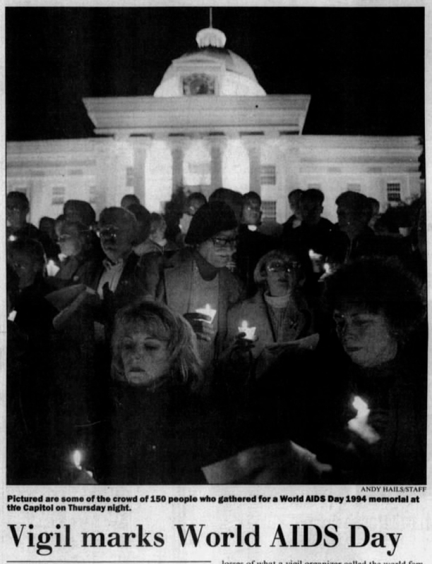 A clipping from a scan of the December 2, 1994 Montgomery Advertiser about a vigil at World AIDs Day. Attendees, holding candles, stand in front of the Capitol steps to commemorate those lost to AIDS.