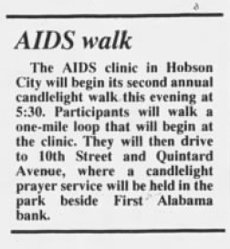 Anniston star, “AIDS Walk,” UAH Archives, Special Collections, and Digital Initiatives, accessed February 11, 2026, https://digitalprojects.uah.edu/items/show/14693.