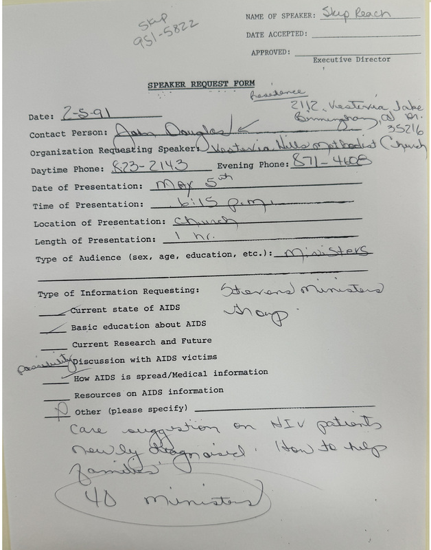 Speaker Request Form, May 5, 1991, file #2145.09.14, Birmingham AIDS Outreach Collection, Birmingham Public Library, Department of Archives and Manuscripts.
