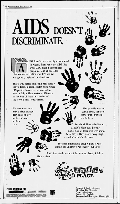 A full page ad in the 1991 Birmingham Post Herald for the charity A Baby's Place in Alabama, explaining their purpose and how AIDS can affect babies and small children.
