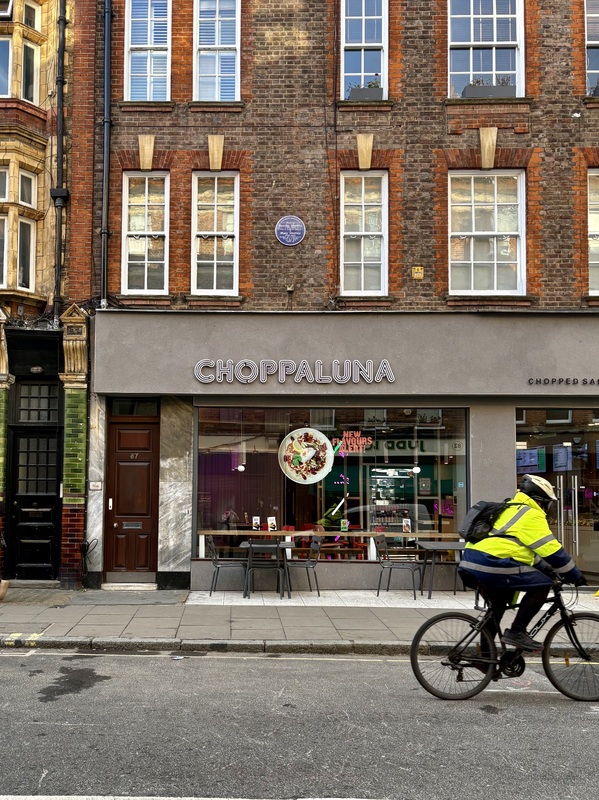 Home of Percy Shelley and Mary Shelley marked by a blue plaque in London, England. Plaque reads "Percy / Bysshe Shelley / 1792-1822 / Poet & Radical Thinker / & / Mary Shelley / 1797-1851 / Author of Frankenstein / lived in a house / on this site / 1815-1816." Photo taken by Sophia Vanderwaal