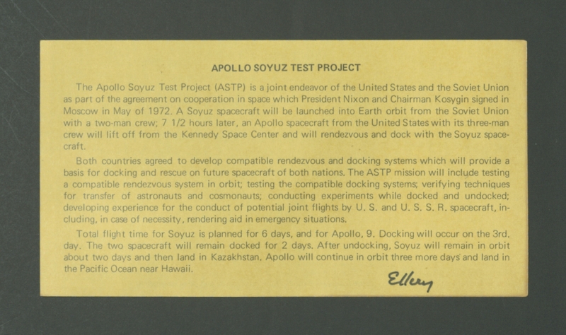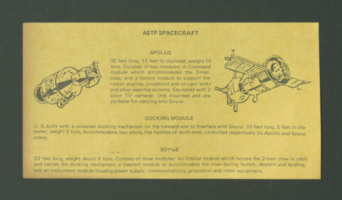 United States. National Aeronautics and Space Administration, “Apollo Soyuz Test Project information card.,” UAH Archives, Special Collections, and Digital Initiatives, accessed February 11, 2026, https://digitalprojects.uah.edu/items/show/15022.