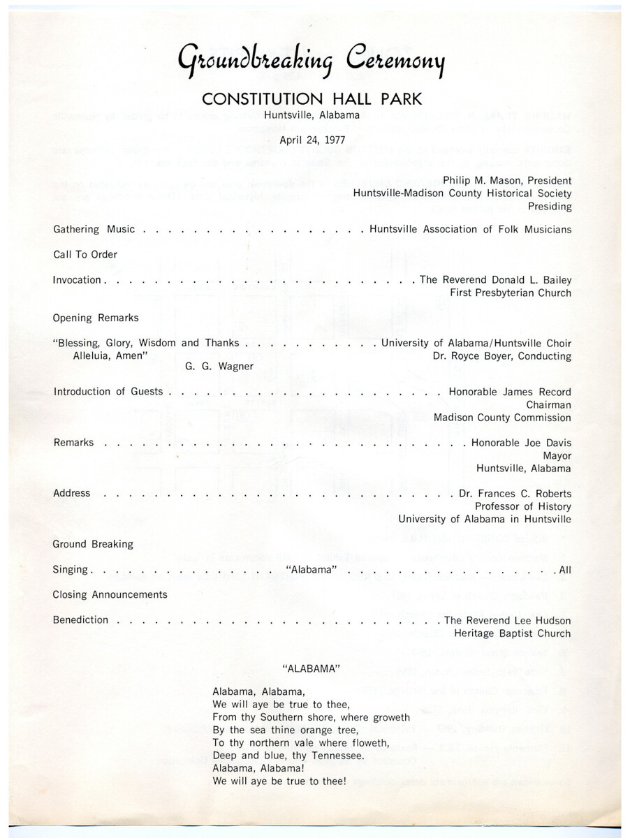 Huntsville-Madison County Historical Society (Ala.), “"Groundbreaking Ceremony: Constitution Hall Park.",” UAH Archives, Special Collections, and Digital Initiatives, accessed February 11, 2026, https://digitalprojects.uah.edu/items/show/3736.