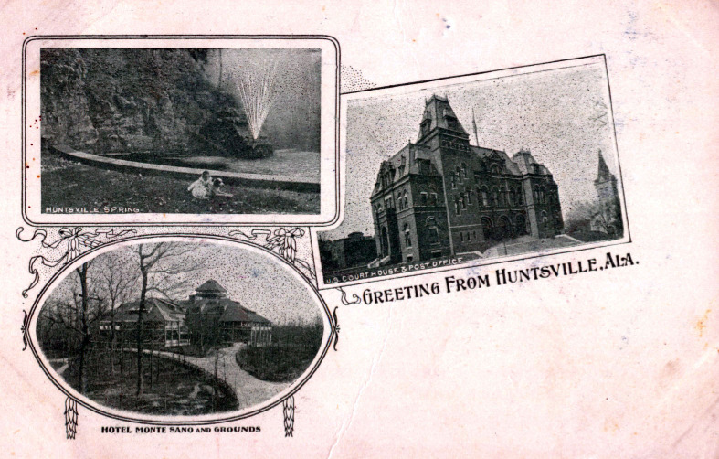 Front: Greetings from Huntsville, ALA. Huntsville, U. S. Court House & Post Office, Hotel Monte Sano and Grounds.
